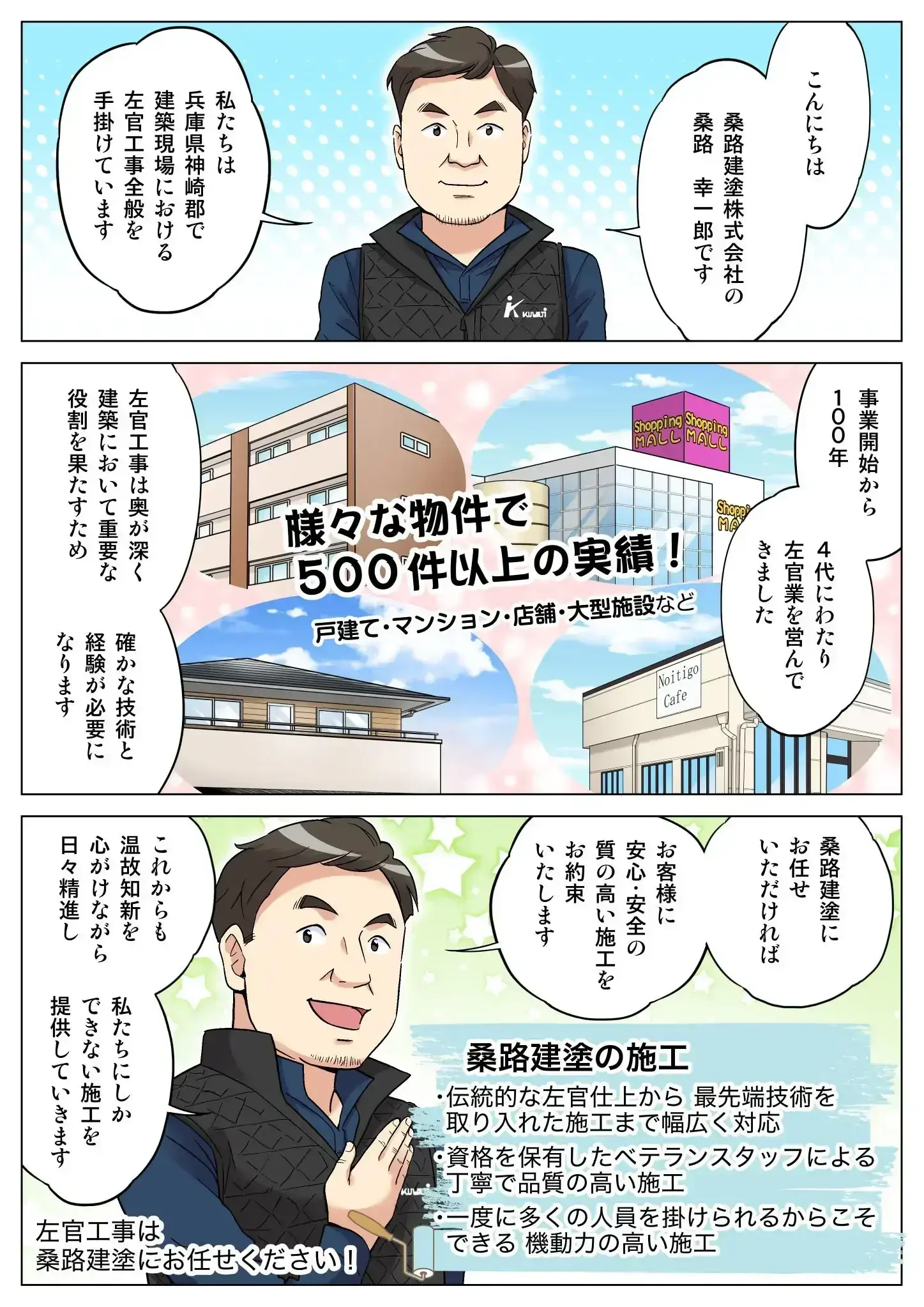 桑路建塗での仕事についてご紹介しています。左官工事の魅力を漫画でわかりやすくご紹介しているので、弊社の仕事について知りたい方はぜひご覧ください。キャリアアップや1日のスケジュールなどもこちらでご確認いただけます。