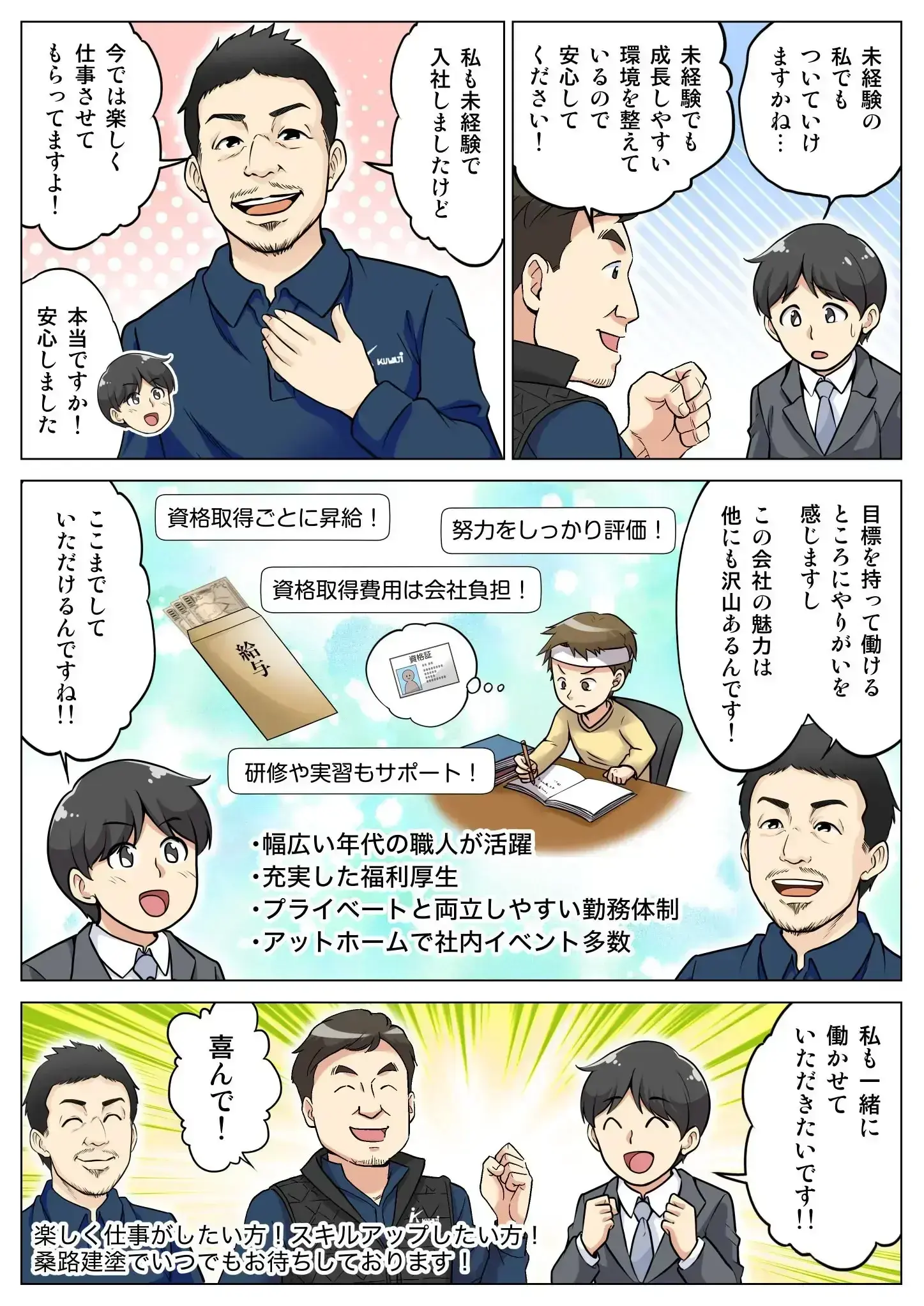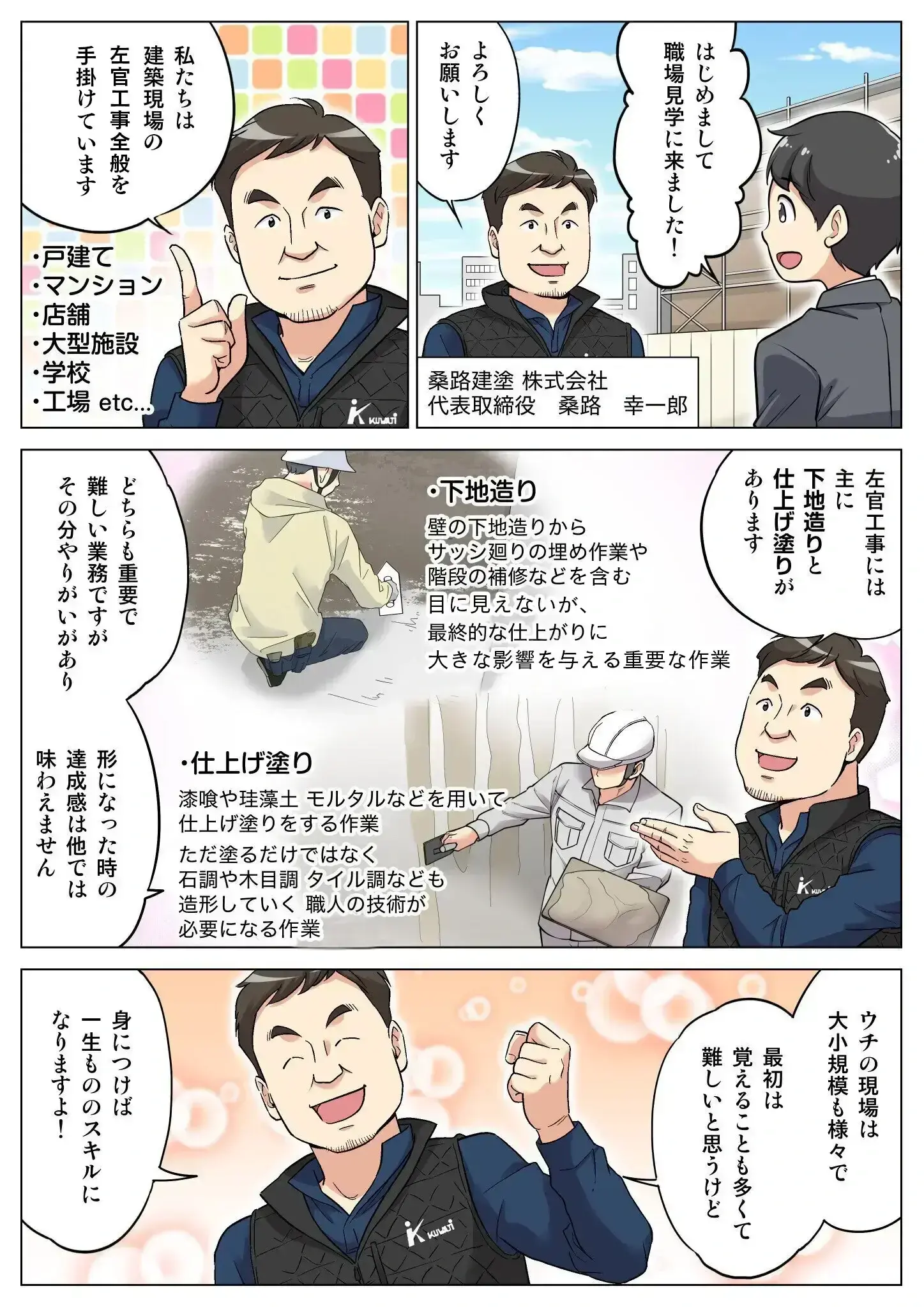 左官の仕事は、職人の技術やセンスが問われる難しい作業です。しかし、その分形になった時の達成感・やりがいは、他の仕事では味わえません。桑路建塗では「楽しく・自分らしく」をモットーに、仕事もプライベートも充実させることができます。仕事の幅を広げ、一生モノの力と専門的なスキルを身に付けることが可能です。
